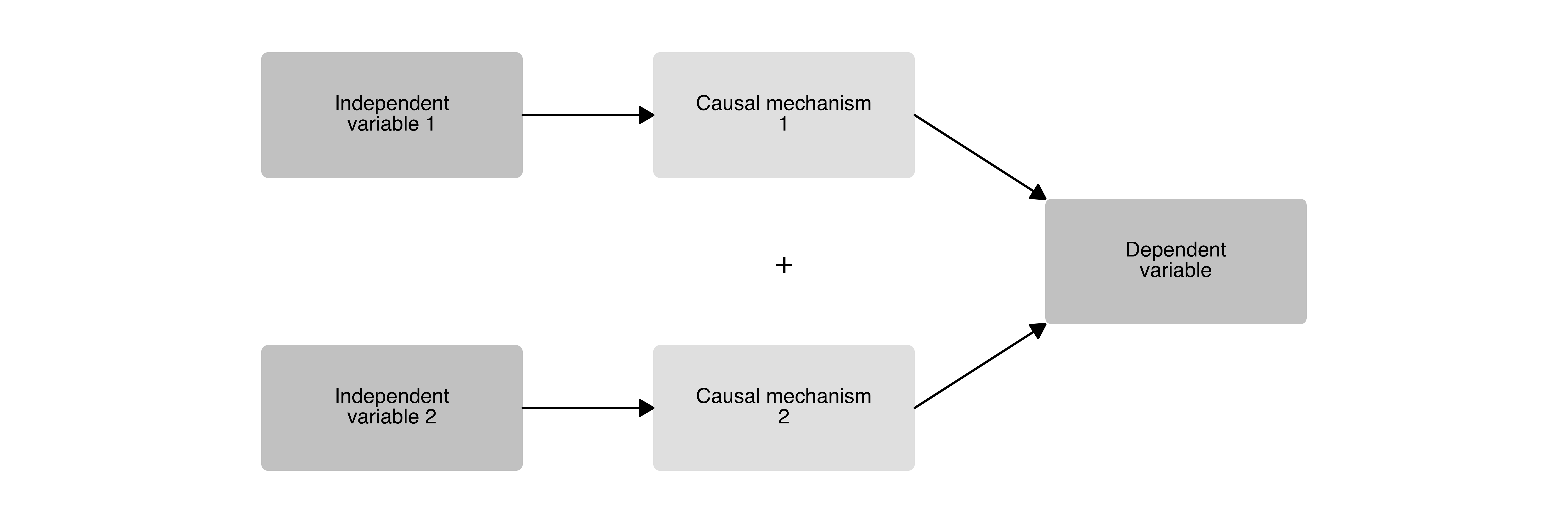 A causal diagram with two independent variables, each operating through its own mechanism, converging on a single outcome. A “+” sign indicates that both mechanisms are necessary.